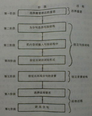 3.第二过程是创立句法结构,它包括第二、三、四个阶段,即为分句选择句法结构,把内容词插入句法结构中,并指定出词的词法结构,选择恰当的功能词。