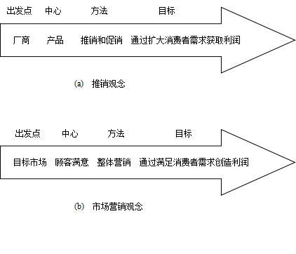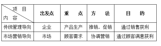 市场营销观念也叫市场营销导向,是以消费者为中心的营销观念,是买方市场条件下产生的一种企业营销观念。在买方市场条件下,产品不断升级换代,市场竞争激烈,企业即使加强销售环节,采用有力的推销术和广告术也不能圆满地解决产品的销售问题。市场营销观念的基本思想是:必须以消费者和用户的需求作为推动企业活动的轴心,加强市场营销调研和预测,了解顾客的需求和欲望,据此制定有效的市场营销计划,生产出比竞争者能更好地满足消费者需求和欲望的产品,在满足市场需求中获取利润。这就是“以消费者为中心”的市场营销观念,在企业经营管理中的具体体现是:“顾客需要什么,企业就经营什么。”市场营销导向是企业营销管理思想上一次巨大的突破,与传统的管理导向相比,有如下不同,见表: