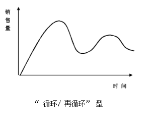 1.再循环形态。指产品销售进入衰退期后,由于种种因素作用而进入第二个成长阶段。这种再循环型生命周期是市场需求变化或厂商投入更多的促销费用的结果。如图8-6所示。