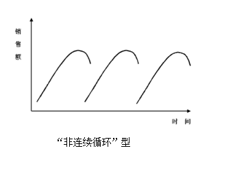 3.非连续循环形态。指一种产品能很快进入市场,被人们狂热接受,使产品销售很快达到顶峰,而又迅速衰退的产品,大多数时髦商品呈此种运动态势。如魔方产品曾在几年内风行全球,然后突然间销售猛降,再也无人问津。如图8-8所示。