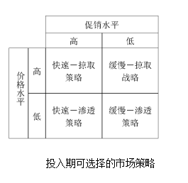 在产品推向市场时,企业必须根据市场条件,掌握好每个营销变数的实施力度,较高的产品质量和合适的分销渠道是其顺利进入市场的基础。如果只考虑价格和促销这两个变数,在投入期可供企业选择的策略有以下几种,如图所示。