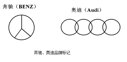 品牌标记是品牌中可以识别,但不能读出声的部分。例如符号、图案或明显的色彩或字母。例如“奔驰”、“奧迪”的标牌、鳄鱼T恤衫的小鳄鱼图案等,都是品牌标记。见图8-3。