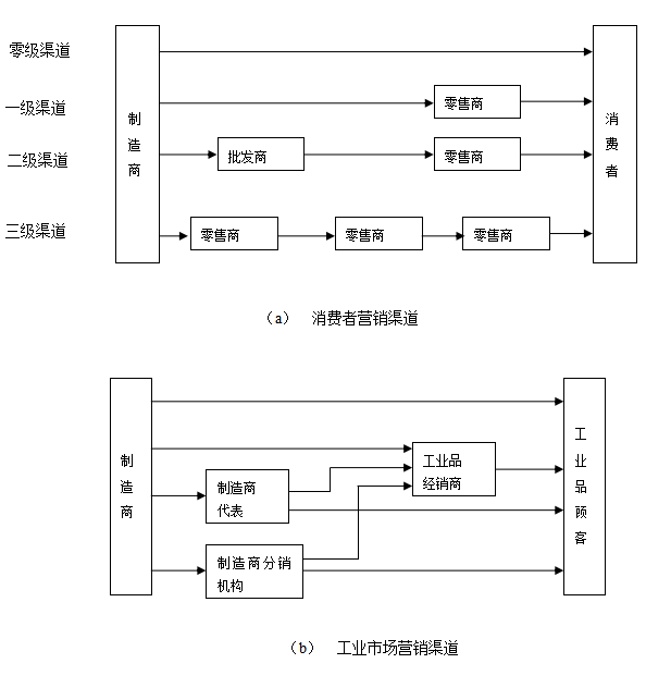 1.一层渠道含有一个市场营销中介机构。在消费者市场,这个中介机构通常是零售商;在产业市场,则可能是销售代理商或佣金商。