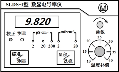 打开SLDS-I型数显电导率仪电源开关(在仪器后面),仪器处于校正状态,校正指示灯亮,预热15 min以上。电导率仪的操作面板的示意图7-1图所示。
