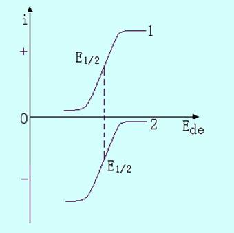 图11-13中曲线2为氧化波。如果一种物质在相同底液中,其还原波和氧化波的半波电位相同,那么它的极谱波是可逆的(图11-13中曲线1与2)。