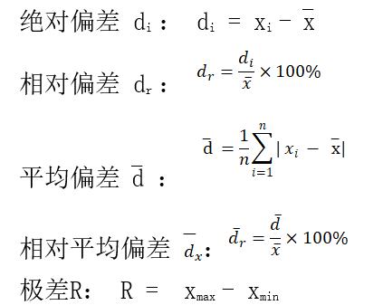 2)精密度与偏差:精密度是指一组平行测定值之间相互接近的程度,用偏差表示,偏差越小,精密度越好,即测量的重现性越好。