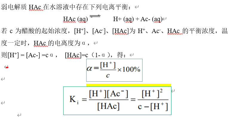 当α<5%时,Ki= [H+]2/c。因此,用pH计测定了已知浓度的醋酸溶液的pH值,就可以计算它的解离度和解离常数。在一定温度下,用酸度计测一系列已知浓度的HAc溶液的pH值,根据pH = -lg[H+],可求得各浓度HAc溶液对应的[H+],利用[H+] = cα,求得各对应的电离度α值,将α代入(2)式中,可求得一系列对应的K值。取α及K的平均值,即得该温度下醋酸的电离常数K(HAc)及α(HAc)。