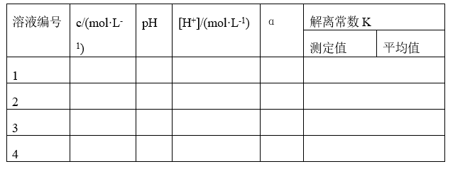 把以上四种不同浓度的醋酸溶液分别适量倒入 4 只洁净干燥的 50 mL 烧杯中,按由稀到浓的次序在 pH 计上分别测定它们的 pH 值,记录数据和室温。计算解离度和解离常数。