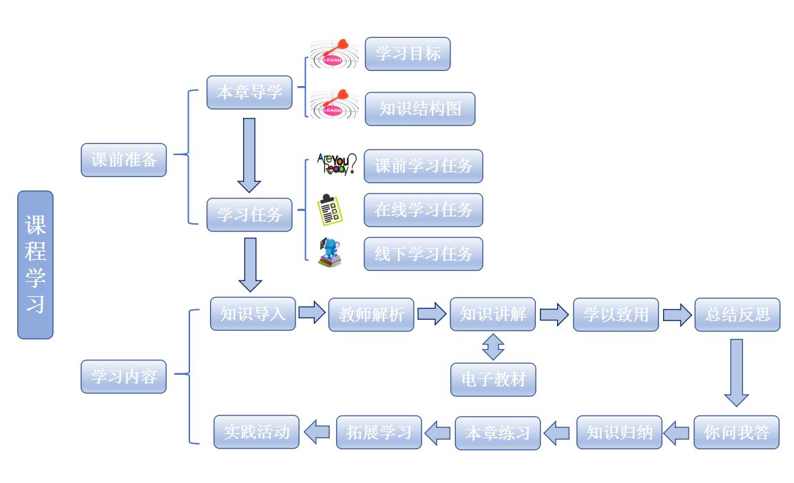 学习每一章时,大家应先做好课前准备。在“课前准备”专栏,我们为大家设置了“本章导学”和“学习任务”。进入“本章导学”,大家可以了解本章的“学习目标”,并且通过“知识结构图”,大致了解本章的学习概要。进入“学习任务”,大家可以进一步明确“课前学习任务”、“在线学习任务”、“线下学习任务”,为本章学习做好充分的准备。