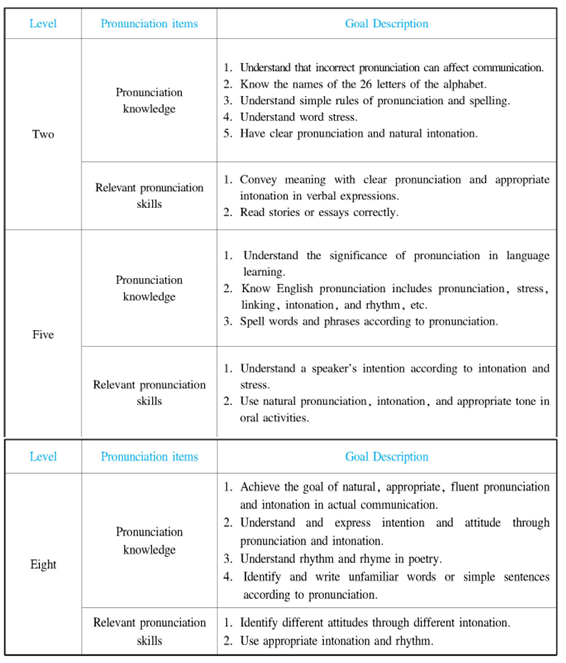 The goals in learning pronunciation vary according to the different stages in foundational education. According to the National Curriculum Standards, the goals of teaching pronunciation in elementary, junior and senior middle schools are as follows:
