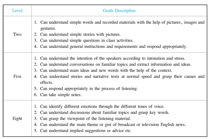 The goals of teaching listening are to train student communicative competence in daily life, enabling accomplishment of tasks in the real-world with the help of listening, and to accelerate learning and development. With further development of cognitive capacity, the requirements for listening capacity increase, so the goals of listening teaching are different in different learning stages. The National Curriculum Standards lists the specific requirements for each level. The following table introduces the goals for level two of elementary school, level five of junior school and level eight of senior school. See Table 10-1.