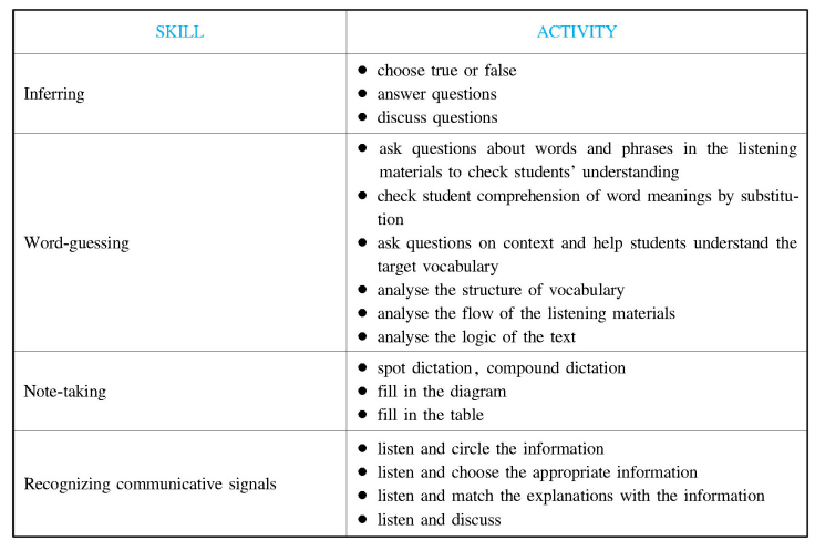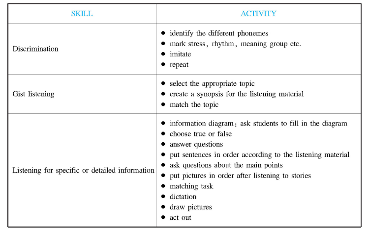 In teaching listening, designing listening activities is the first step towards effective teaching, so it is necessary to understand the functions of various teaching activities. The following table lists a number of common listening activities.
