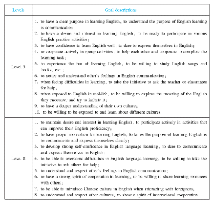 In line with the emotional development of students of different ages, the National Curriculum Standards for ELT also breaks down the goals of teaching emotion into different stages. At the elementary school stage, the key is to enable students to experience the fun of learning English, and make learning English a part of the mental development of young children. Teachers should not emphasize the practical effect of learning English, nor see it as a tool. In the junor middle school stage, students can be gradually guided to understand the purpose and significance of learning English. They should also be guided to realize that emotions and attitudes and learning English are closely related. Special attention should be paid to students who have difficulty in learning English. In the senior middle school stage, the aim is to improve their capacity for independent thinking and judgment; develop their ability in communication and cooperation; enhance their understanding and ability in inter-cultural communication; establish a correct outlook on life, the world and values; develop their social responsibility; and encourage overall self-improvement.