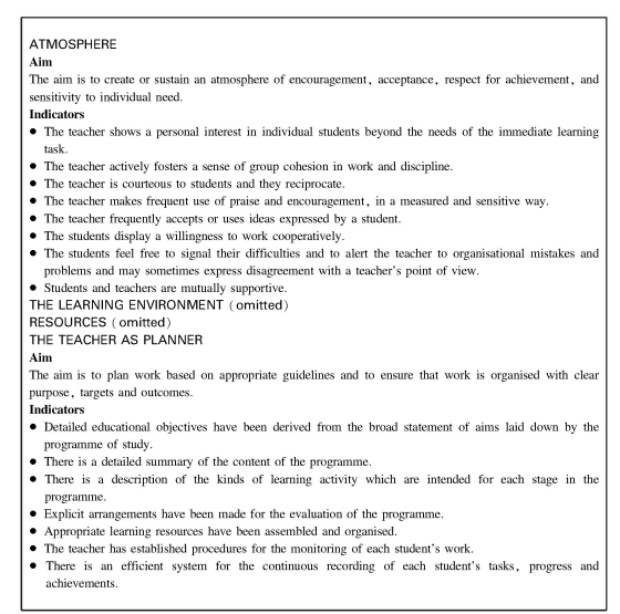Wang(2005:198)cited criteria for teaching evaluation used in the US and England. One of the criteria used in the US has four components: the organization of learning content;creation of learning environment;and development of teaching and teachers. The criteria of evaluation in England(See Table 16-2)includes learning atmosphere;classroom environment;resources;the teacher as planner;the teacher as deliverer or leader;the teacher as facilitator and guide;and the role of students. These two sets of criteria attach importance to the development of both teachers and learners.